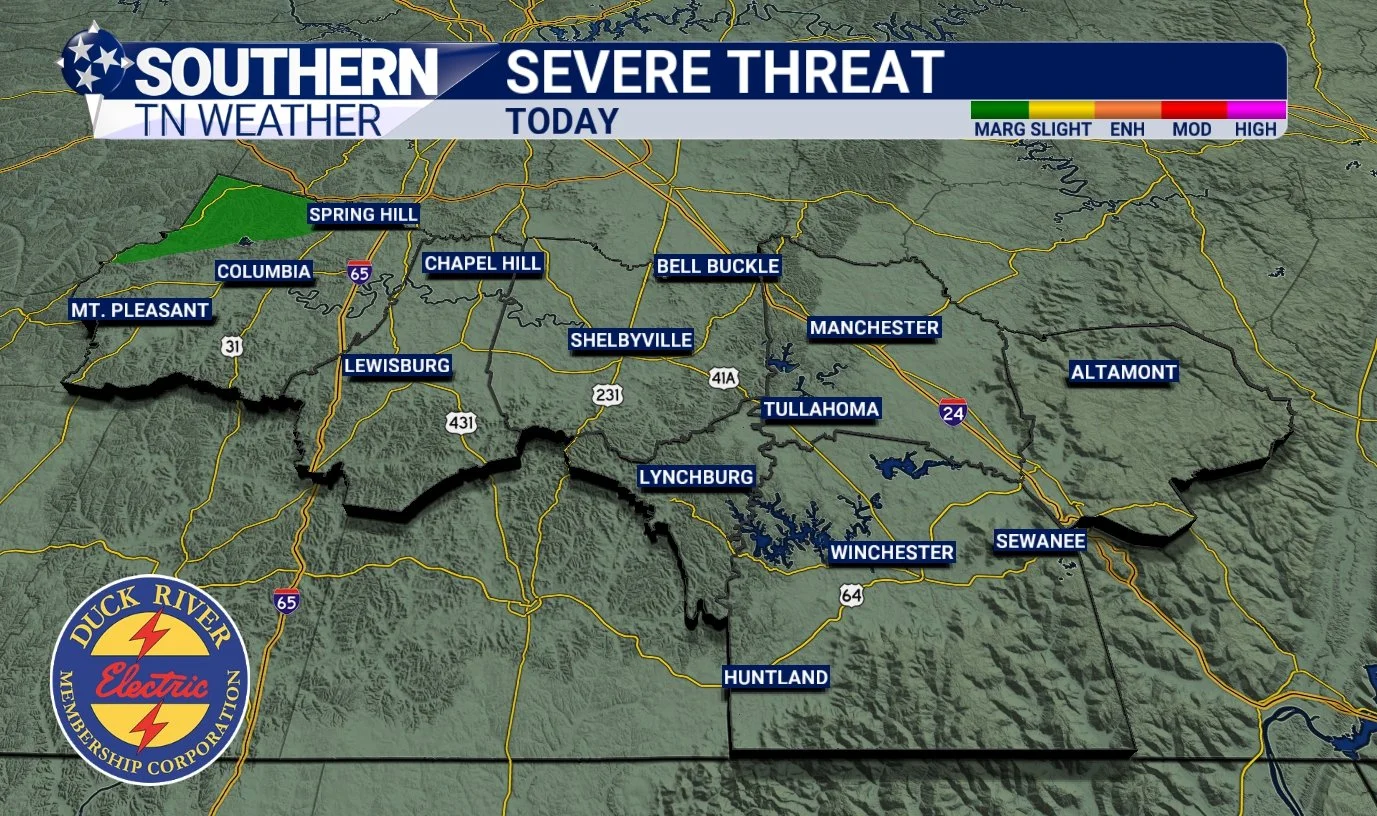 The Storm Prediction Center has placed far NW Maury County under a MARGINAL risk (level 1/5) for severe weather tonight. The main risk is focused to the northwest (between Paducah, KY and Clarksville, TN) where the best storm fuel (instability) exists. Locally, our question marks with stormage comes down to two things: